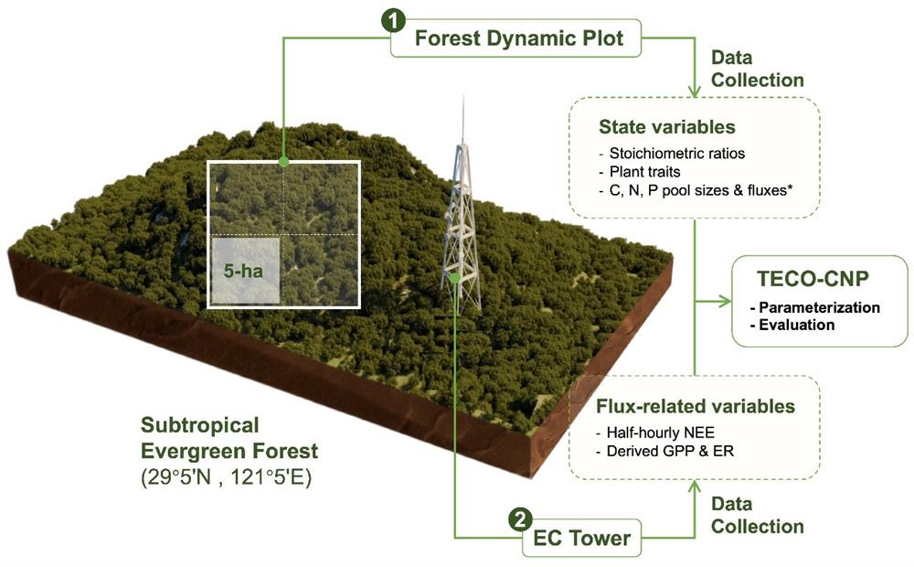 陆地生态系统模型是生态学研究的重要工具,能够深化我们对于生态系统功能的理解,并预测其在全球变化背景下的动态响应。浙江天童森林生态系统国家野外科学观测研究站在国际学术期刊 Geoscientific Model Development 上在线发表了陆地生态系统碳氮磷耦合过程模型(Terrestrial ECOsystem Carbon, Nitrogen, Phosphorus Coupled Model; 以下简称“TECO-CNP”)Sv1.0版本。该模型为深入理解常绿阔叶林生态系统中碳、氮、磷的耦合循环机制及其对全球变化的响应,提供了关键的技术支撑与模拟平台。