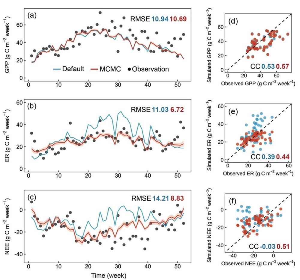 图3 2021年天童站点周尺度碳通量观测值与使用默认参数与优化参数的模型模拟值的对比。(a-c) 观测值(黑色圆点)与默认参数(蓝色实线)、优化参数(红色实线)模拟值的时间序列对比,其中优化结果从数据同化过程接受的10,000组参数中随机抽取1000组进行计算。图中阴影区域表示标准差。(d-f) 对应时间序列的模拟值与观测值散点图,虚线为1:1基准线。统计指标:相关系数(correlation coefficient,CC),均方根误差(root mean square error,RMSE)