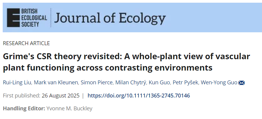 2025年8月,郭文永教授研究团队发表于Journal of Ecology的论文“Grime’s CSR theory revisited: a whole-plant view of vascular plant functioning across contrasting environments”,通过整理并计算7037种物种的CSR策略值,结合15种环境偏好变量和31项涵盖地上、地下和繁殖性状的功能性状指标,系统分析了物种CSR值与环境变量和功能性状之间的关系。
