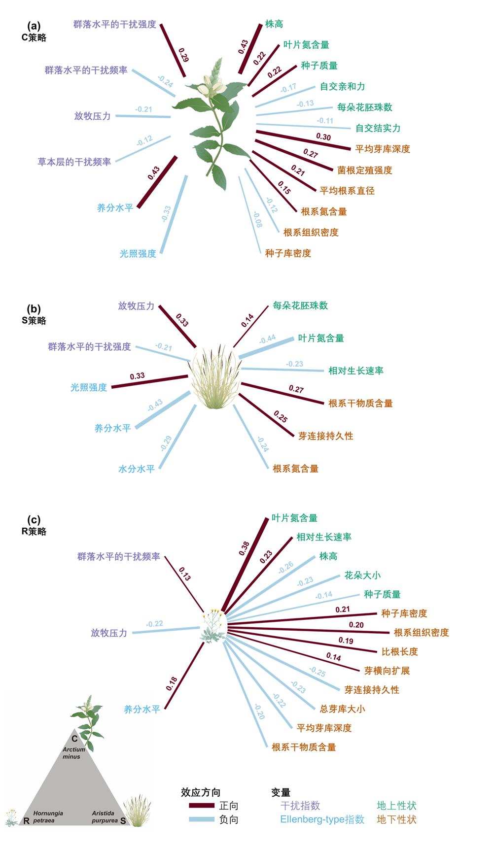 研究结果表明,CSR策略值与植物对胁迫与干扰的环境偏好高度相关,支持Grime假说在不同物种和环境背景下的普遍适用性。同时,CSR策略还与植物从根到茎的多种功能性状呈稳健关联。具体而言,C-选择型物种适应于养分丰富、环境稳定的栖息地,常具有较大的种子和丰富的芽库;S-选择型物种多分布于光照充足、可承受放牧的区域,具厚叶片并偏好自交;而R-选择型物种则主要出现在土壤扰动频繁、养分充足的生境中,拥有致密种子库以提升再生能力。本研究为 CSR 理论提供了强有力的实证支持,并拓展了与 CSR 轴显著相关的功能性状类型和范围。CSR 理论在理解植物适应性及生态功能方面具有广泛适用性,可作为探究群落构建、功能性状多样性和进化生态学的重要理论工具,尤其是在当前气候变化和人为干扰加剧的背景下,具有重要的理论价值和应用意义。