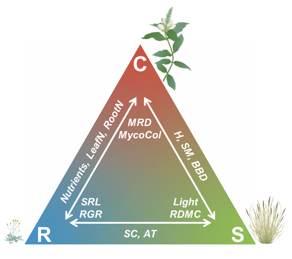 为了理解植物在性状权衡约束下如何适应环境,Grime 提出了由竞争型(C)、耐胁迫型(S)和杂草型(R)构成的生态策略理论(即 CSR 理论)。该理论框架基于植物对两种关键环境因素—干扰和胁迫—的响应,将物种归纳并划分为不同策略类型。尽管 CSR 理论在生态学研究中得到广泛应用,其对物种特异性环境偏好的解释力仍缺乏系统验证;同时,这些策略与根系和繁殖等相关功能性状的关系也有待深入解析。