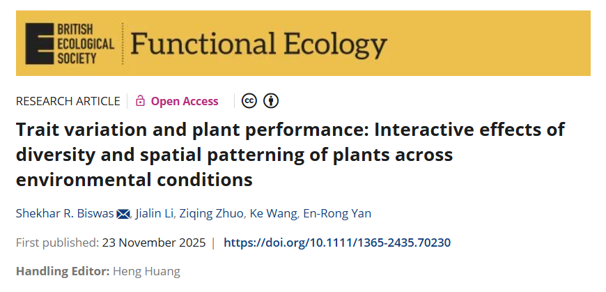 围绕这一科学问题,华东师范大学生态与环境科学学院Shekhar R. Biswas 教授团队在《Functional Ecology》上发表了题为 《Trait variation and plant performance: Interactive effects of diversity and spatial patterning of plants across environmental conditions》 的研究论文。该研究通过控制实验,系统揭示了植物多样性与空间分布对性状变异的交互影响,及其在不同水分条件下的生态后果。