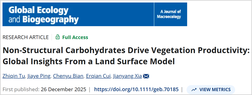 近日,国际生态与生物地理学期刊 Global Ecology and Biogeography 在线发表了华东师范大学生态与环境科学学院夏建阳团队题为"Non-structural carbohydrates drive vegetation productivity: global insights from a land surface model"的研究论文。该研究基于全球陆面模式模拟结果,结合可溯源性分析框架与收敛交叉映射(CCM, Convergent Cross-Mapping)因果推断方法,系统评估了植物非结构性碳水化合物(NSC, Non-structural carbohydrates)与总初级生产力(GPP, Gross primary productivity)之间的双向因果关系,揭示了NSC在全球尺度上对植被生产力变化的重要调控作用。研究结果挑战了传统以“光合作用主导”为核心的植被生产力建模视角,强调了植物内部碳储存与分配过程在调控光合作用中的关键作用。
