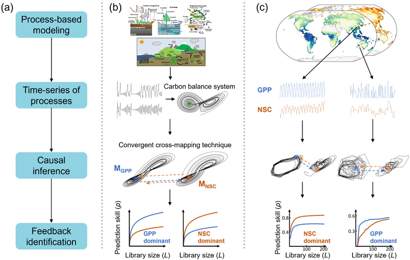 针对上述问题,本研究利用美国国家大气研究中心(NCAR)开发的陆面模式(Community Land Model version 5, CLM5),选取两种具有不同植被结构假设的植被模块(CLM5-BGC 和 CLM5-FATES),对全球陆地生态系统碳循环过程进行了模拟与评估。在此基础上,研究团队引入收敛交叉映射方法,在全球像元尺度上定量识别NSC与GPP之间因果作用的强度及其空间变异特征,并进一步基于提出的可溯源性分析框架,对驱动因子进行系统解析(图1)。