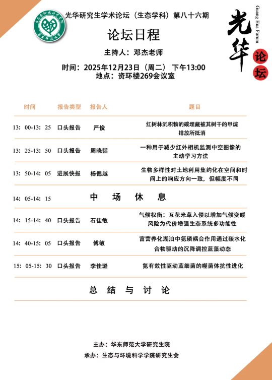 2025年12月23日下午13:00,生态与环境科学学院第八十六期研究生光华学术论坛在资环楼269室顺利举行。本期论坛由生态与环境科学学院邓杰老师主持,点评嘉宾为陈迎老师,高德壮老师。