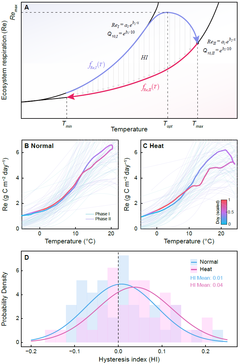 图1. 生态系统呼吸作用(Re)的热迟滞现象及其在热浪观测数据中的应用。(A)迟滞框架示意图。fRe,I和fRe,II分别代表增温阶段和降温阶段拟合的生态系统呼吸—温度响应曲线。(B)正常年份观测证据。(C)热浪年份观测证据。(D)迟滞指数(HI)的概率密度分布图,展示了站点尺度HI在正常年份(蓝色)和热浪年份(粉色)的分布。