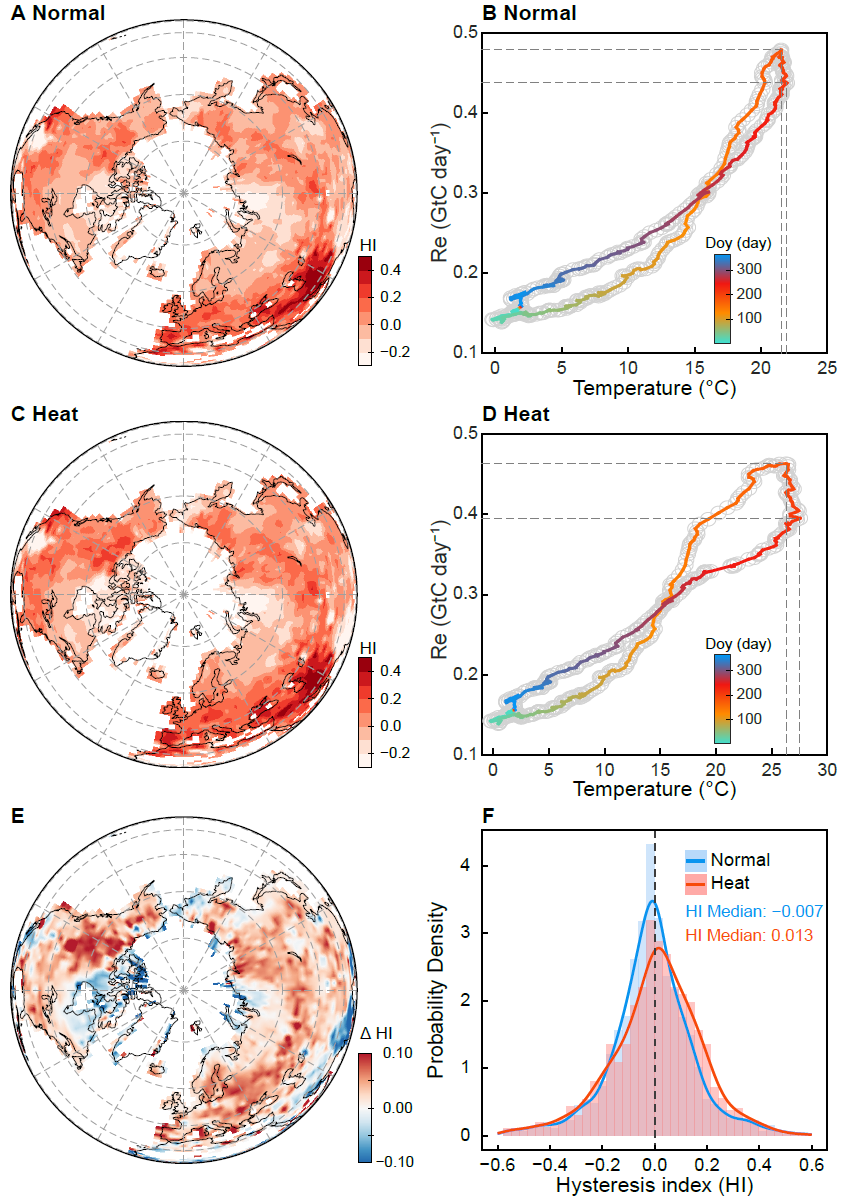 图2. CLM5陆面过程模型模拟下的生态系统呼吸作用热迟滞现象。(A)常规模拟下HI的空间分布。(B)常规模拟下北半球生态系统呼吸对温度变化的响应曲线。(C)热浪模拟场景下HI的空间分布。(D)热浪模拟下北半球生态系统呼吸对温度变化的响应曲线。(E)HI差异的空间分布。(F)HI在CLM5两个模拟场景下的概率密度分布。