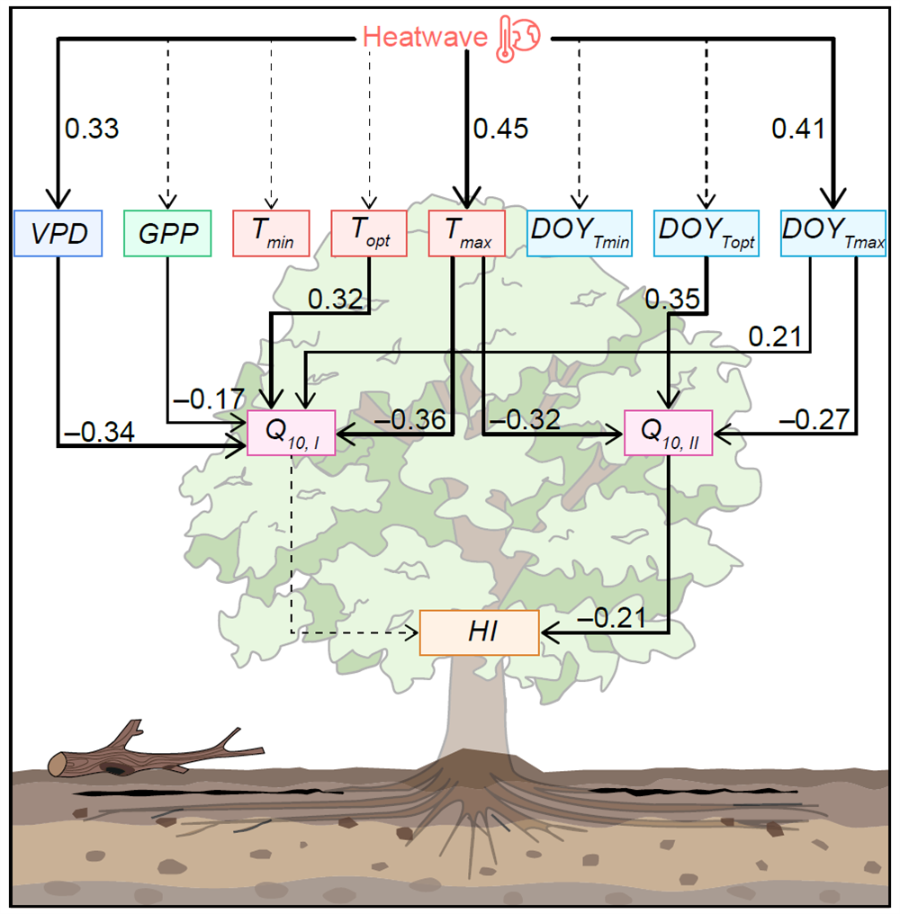 图3. 基于观测数据的结构方程模型,揭示热浪作用下生态系统呼吸作用温度敏感性与热迟滞现象的控制路径。