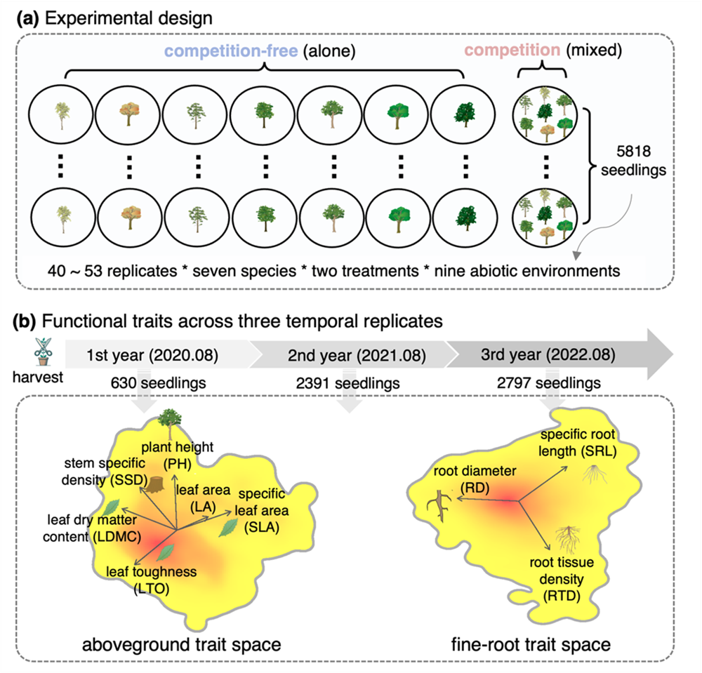 在自然群落中,树木个体之间持续围绕光照、水分和养分等关键资源展开竞争。基于性状的生态学研究,通常通过功能性状来描述物种的资源利用策略,并利用种间性状差异(interspecific trait dissimilarity, ITD)来理解竞争强度及其结果。然而,这一框架往往默认功能性状及种间性状差异是相对固定的属性。例如,较高的株高通常意味着更强的光资源获取能力,较发达的根系则往往对应更高的地下资源利用能力。事实上,植物性状会随竞争发生变化,而当不同物种对邻体的响应方式不同时,种间性状差异本身也会随之改变。与此同时,树木的资源获取策略并非由单一性状决定,而是由多个地上和地下性状共同塑造。基于此,本研究分别在地上和地下多维性状空间中,检验邻体存在是否会改变物种间的功能差异,以及这些变化如何进一步影响竞争强度。
