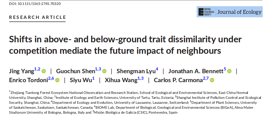 相关成果以"Shifts in above- and below-ground trait dissimilarity under competition mediate the future impact of neighbours"为题发表于Joural of Ecology。本研究第一作者为杨菁,华东师范大学生态与环境科学学院博士后(现为爱沙尼亚塔尔图大学功能生态学博士后),通讯作者为沈国春教授。共同作者包括:华东师范大学王希华教授,伍斯宇博士生;爱沙尼亚塔尔图大学Carlos P. Carmona 教授;Enrico Tordoni博士;瑞士洛桑大学吕胜满博士;加拿大萨斯喀彻温大学Jonathan A. Bennett教授。